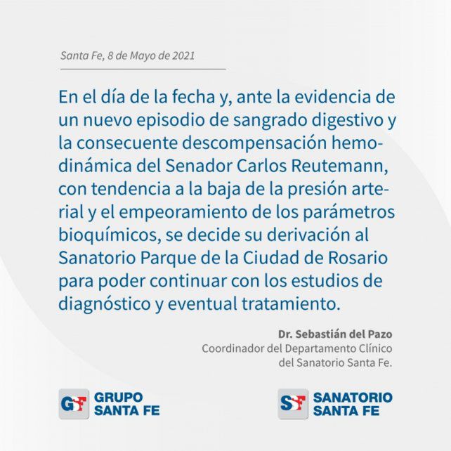 En un comunicado que lleva la firma del coordinador del Departamento Clínico del Sanatorio Santa Fe, Sebastián del Pazo, se indicó que este sábado "y ante la evidencias de un nuevo episodio de sangrado digestivo y la consecuente descompensación hemodinámica del senador Carlos Reutemann, con tendencia a la baja de la presión arterial y el empeoramiento de los parámetros bioquímicos, se decide su derivación al Sanatorio Parque de la ciudad de Rosario para poder continuar con los estudios de diagnóstico y eventual tratamiento".