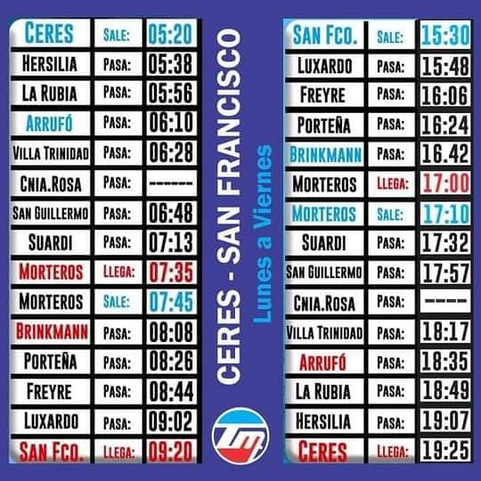 Así lo informó la empresa a través de un comunicado. Será desde este lunes. Parte de Ceres a las 5,20 hs. mientras que el retorno desde San Francisco es a las 15,30 hs.