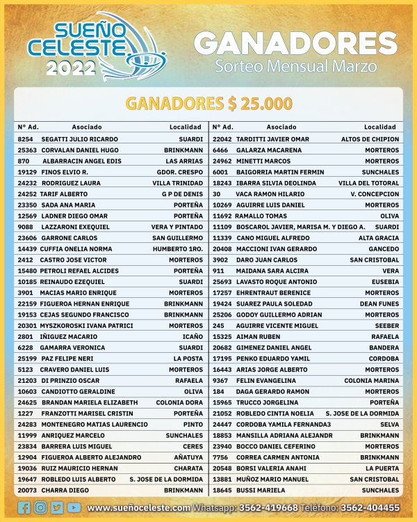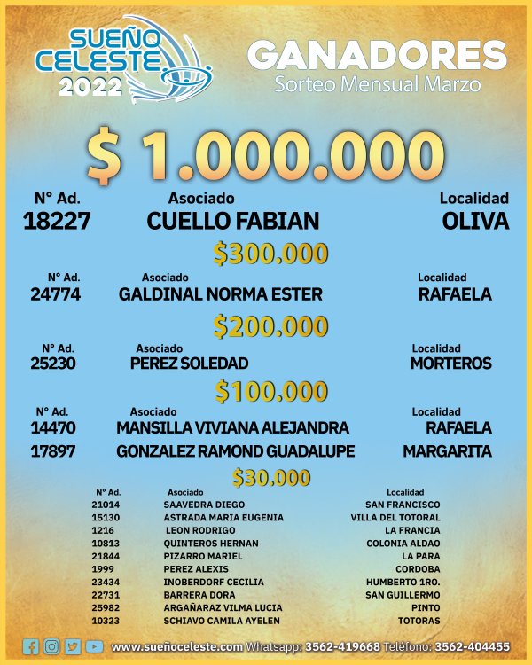 El premio mayor de 1 millón de pesos de la promoción de Mutual 9 de Julio de Morteros, lo ganó un socio de la localidad de Oliva. Todos los ganadores