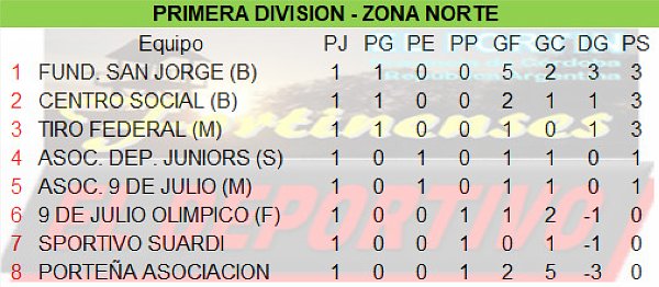 Se abrió la temporada en la Zona Norte de la Liga San Francisco con sendas victorias de San Jorge y Centro de Brinkmann. Tiro derrotó de visitante a Sportivo, mientras que en Morteros, igualaron 9 de Julio y Juniors