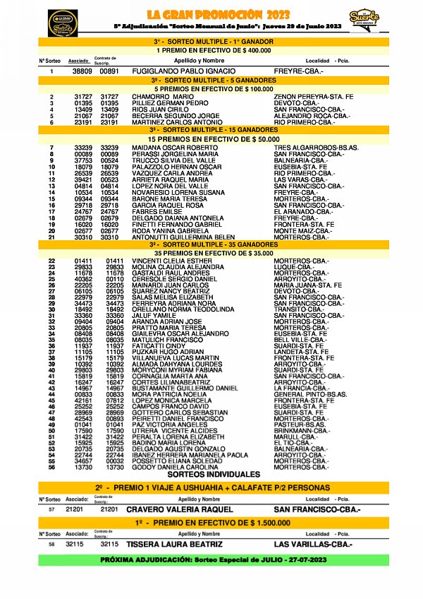 El premio mayor de $ 1.500.000 quedó para una asociada de Las Varillas. Hubo varios ganadores de Suardi. En julio habrá un sorteo especial con 6 millones y un auto