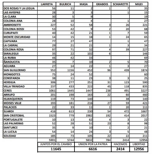 En el departamento se impuso Javier Milei con un total de 12956 votos. Juntos por el Cambio sumó 11645 votos, siendo Larreta el ganador de la interna con 5901 sufragios. El kirchnerismo terminó en el tercer lugar con 6616 votos