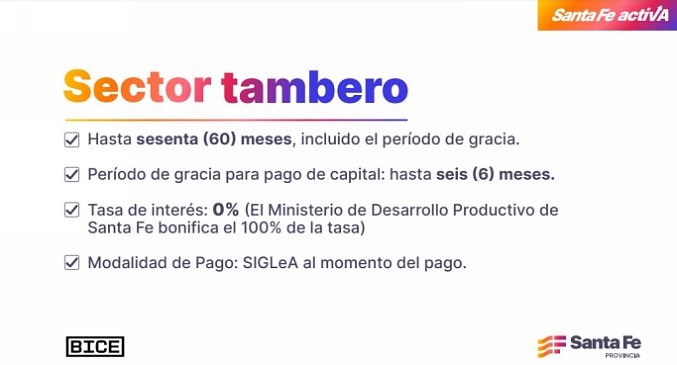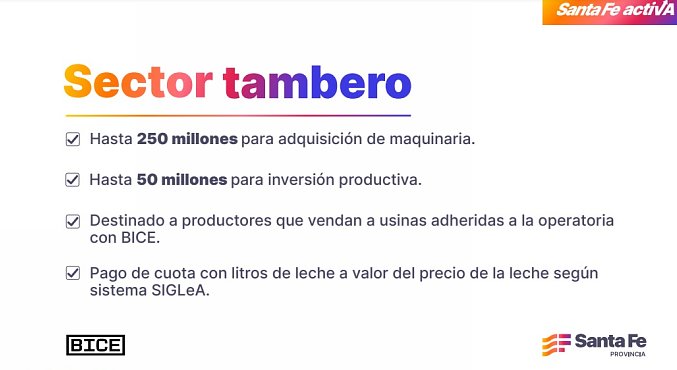 Los créditos están destinados a productores que vendan a usinas adheridas a la operatoria con BICE. El pago de cuota será con litros de leche a valor del precio de la leche según sistema SIGLeA; con un plazo de hasta 60 meses, incluido el período de gracia; y con un período de gracia para pago de capital de hasta 6 meses. La tasa de interés es del 0% (el Ministerio de Desarrollo Productivo de Santa Fe bonifica el 100% de la tasa).