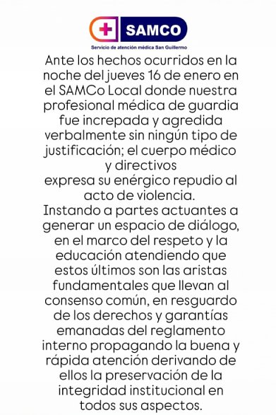 El Samco de San Guillermo repudia la agresión a una médica de guardia