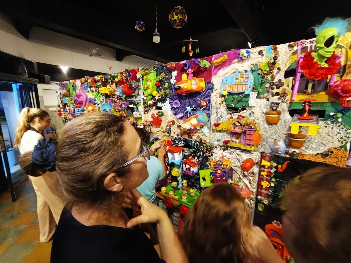 “Es un proyecto que ha tomado años de trabajo, amor y dedicación para proteger las infancias y celebrar la creatividad” destacaron. El espacio está recubierto de juguetes montados, pegados, superpuestos en una estética de cotillón.