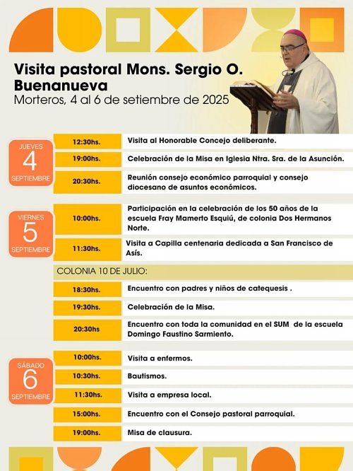 El obispo de la Diócesis de San Francisco, estará en Morteros dese este jueves al sábado 6. Se reunirá con padres, niños, e integrantes de la Parroquia de la ciudad. Visitará enfermos, empresas y al Concejo Deliberante. También estará en Col. Dos Hermanos y 10 de Julio