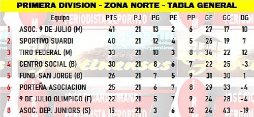 POSICIONES CLAUSURA: 9 de Morteros 16, Tiro 14, Sportivo 12, Centro y San Jorge 8, Porteña y Juniors 7, 9 de Freyre 6